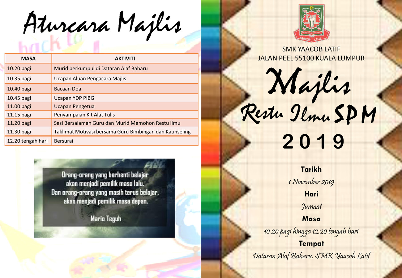 majlis telah dimulakan dengan ucapan dari pk1 ustaz nasa. Jangan leka dan terus beri tumpuan kepada spm dan in sya allah urusan kalian akan dipermudahkan nanti. Majlis restu ilmu merupakan langkah dan persediaan terakhir calon pt3 untuk menghadapi peperiksaan sebenar. Majlis keputusan rasmi pt3 2019. Majlis peperiksaan malaysia portal rasmi sistem online.