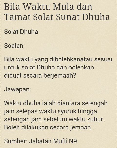 Solat sunat dhuha dilakukan apabila matahari telah naik pada waktu pagi sekadar satu galah tingginya. Masanya adalah 28 minit selepas syuruk, iaitu sekiranya waktu syuruk 7.32 pagi dan ditambah 28 minit, maka masuknya waktu dhuha bermula jam 8.00 pagi. Solat fardu merupakan salah satu dari rukun islam. Setelah masuk waktu zuhur, maka tamatlah waktu dhuha (10 minit sebelum zuhur). Simak, 8 hal yang dapat membatalkan puasa ramadhan Sholat dhuha adalah sholat sunnah yang dikerjakan pada waktu pagi atau waktu dhuha. Rasulullah saw mengerjakan dengan 2 rakaat salam, 2 rakaat salam, dan terkadang ditambahkan beberapa rakaat sesuai yang dikehendaki. Luar biasa solat & doa dhuha yang dikurniakan allah kepada manusia ruang waktu dan waktu afdal solat dan doa dhuha. Ini kerana waktu solat sunat dhuha bermula dari terbitnya matahari sehinggalah sebelum matahari tegak di atas kepala. Bacaan doa sholat dhuha lengkap beserta artinya. Waktu solat hajat yang dilarang selanjutnya adalah waktu dimana matahari akan mulai terbenam hingga terbenam seluruhnya. Dan ini sesuai dengan keterangan hadis yang diriwayatkan oleh 'amr bin 'abasah. Waktu terbit matahari + 15 menit.